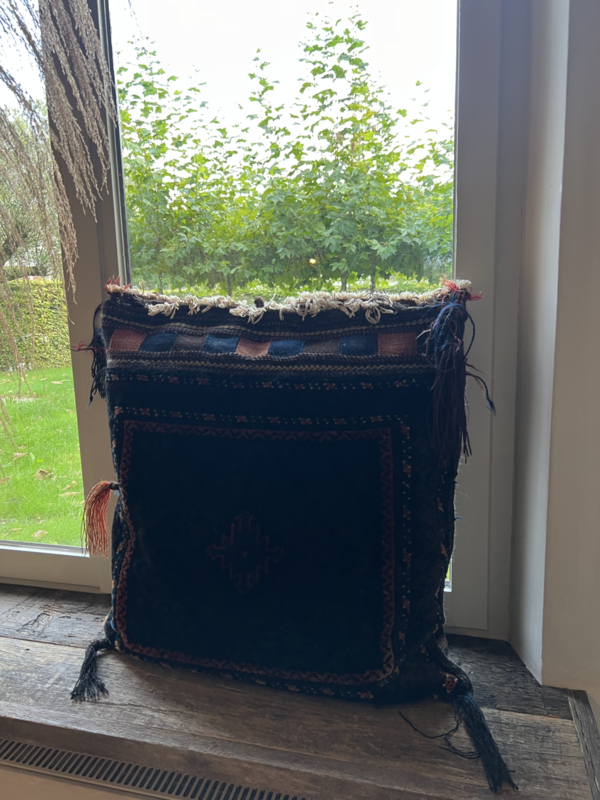 Dit prachtige vintage Perzische kussen is gemaakt van een originele, handgeweven kamelenzak. Ooit gebruikt door nomaden in Perzië om hun bezittingen tijdens reizen te vervoeren, is dit unieke textiel nu herwerkt tot een bijzonder authentiek kussen met een rijke geschiedenis.